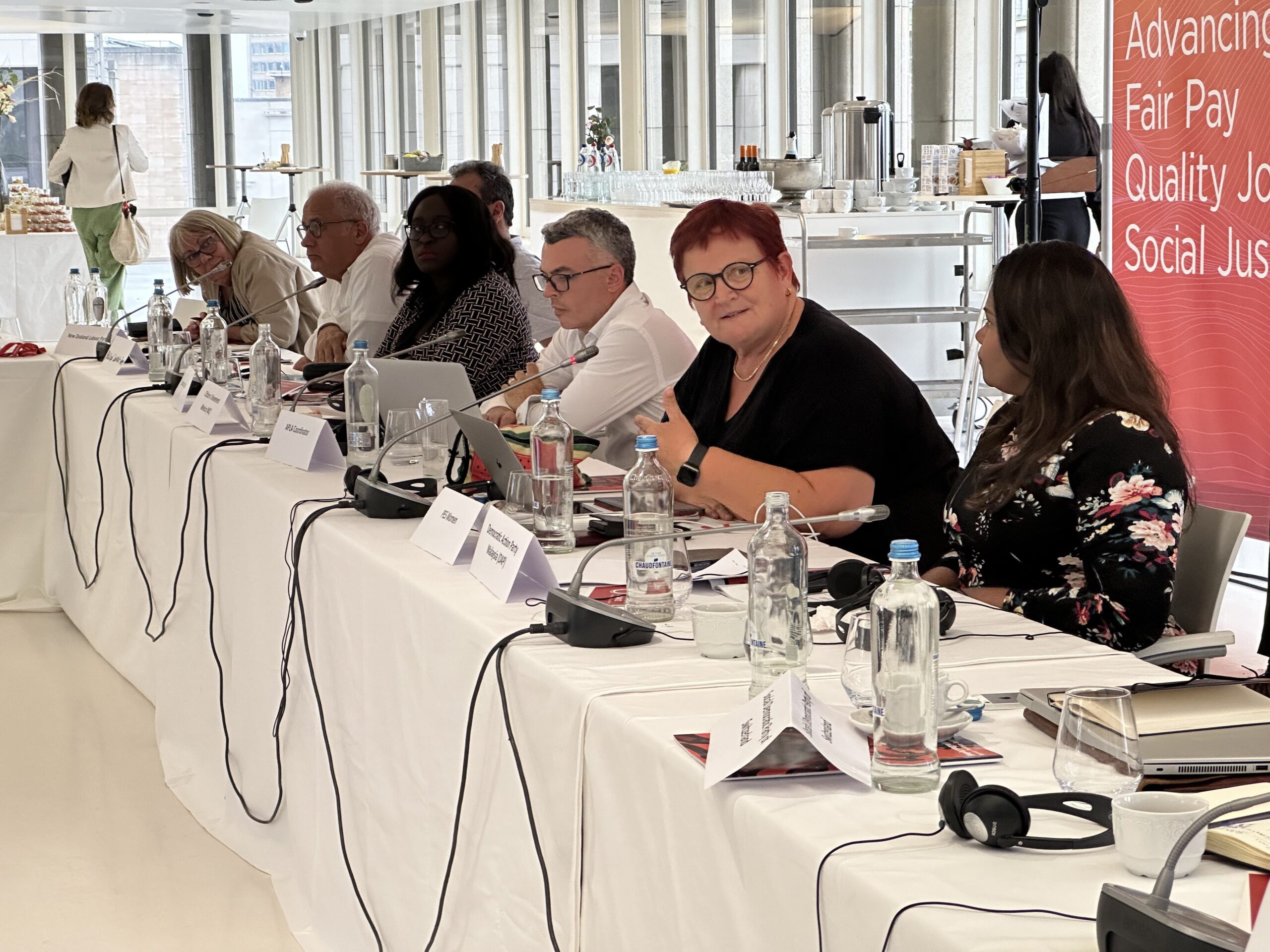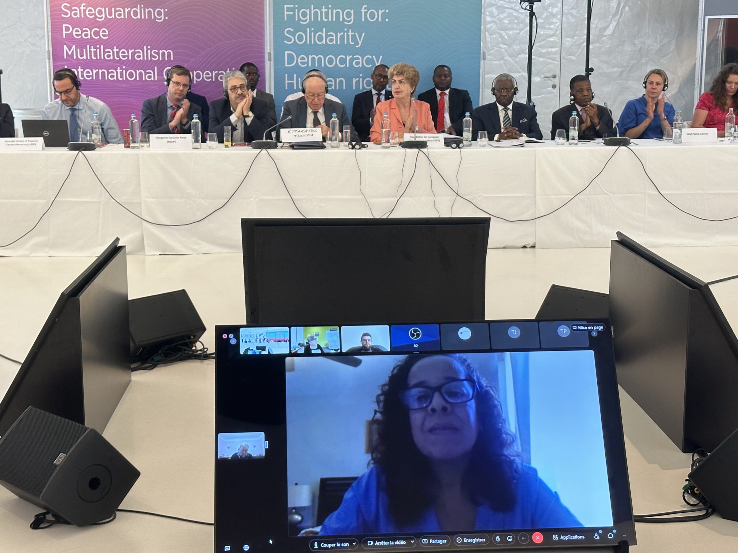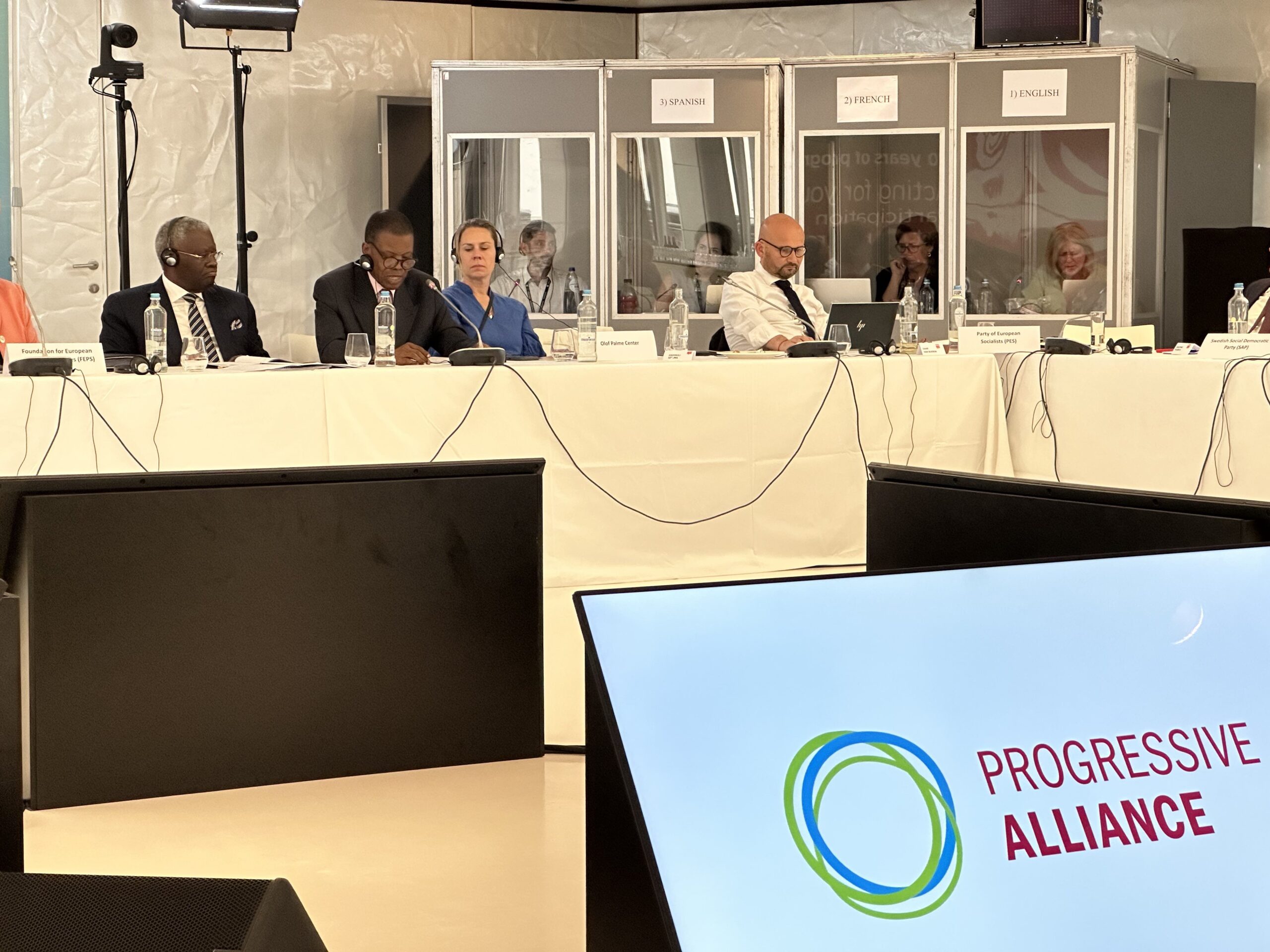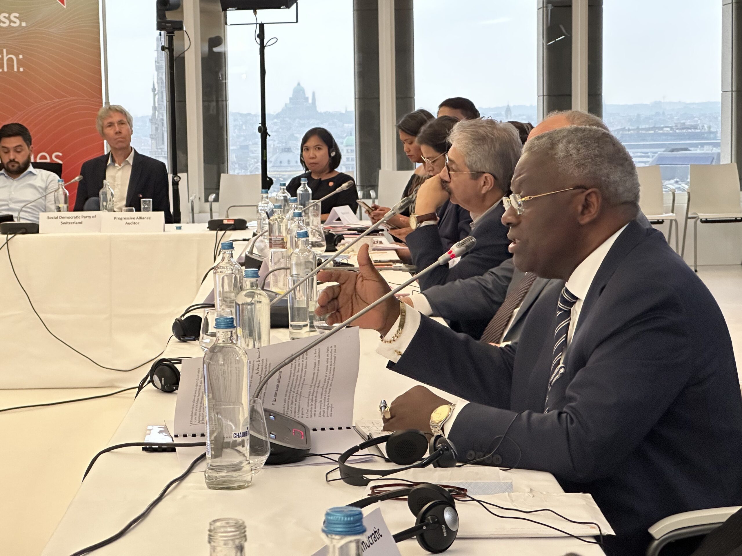 Los coordinadores regionales de AP Esteban Paulón (Las Américas), Marlon Cornelio (SocDem Asia/Pacífico), Bonaventure Mbaya (África Central), Mustapha Ben Jaâfar y Khelil Ezzaouia (Foro Socialdemócrata Árabe) informaron sobre el desarrollo de AP en sus respectivas regiones.