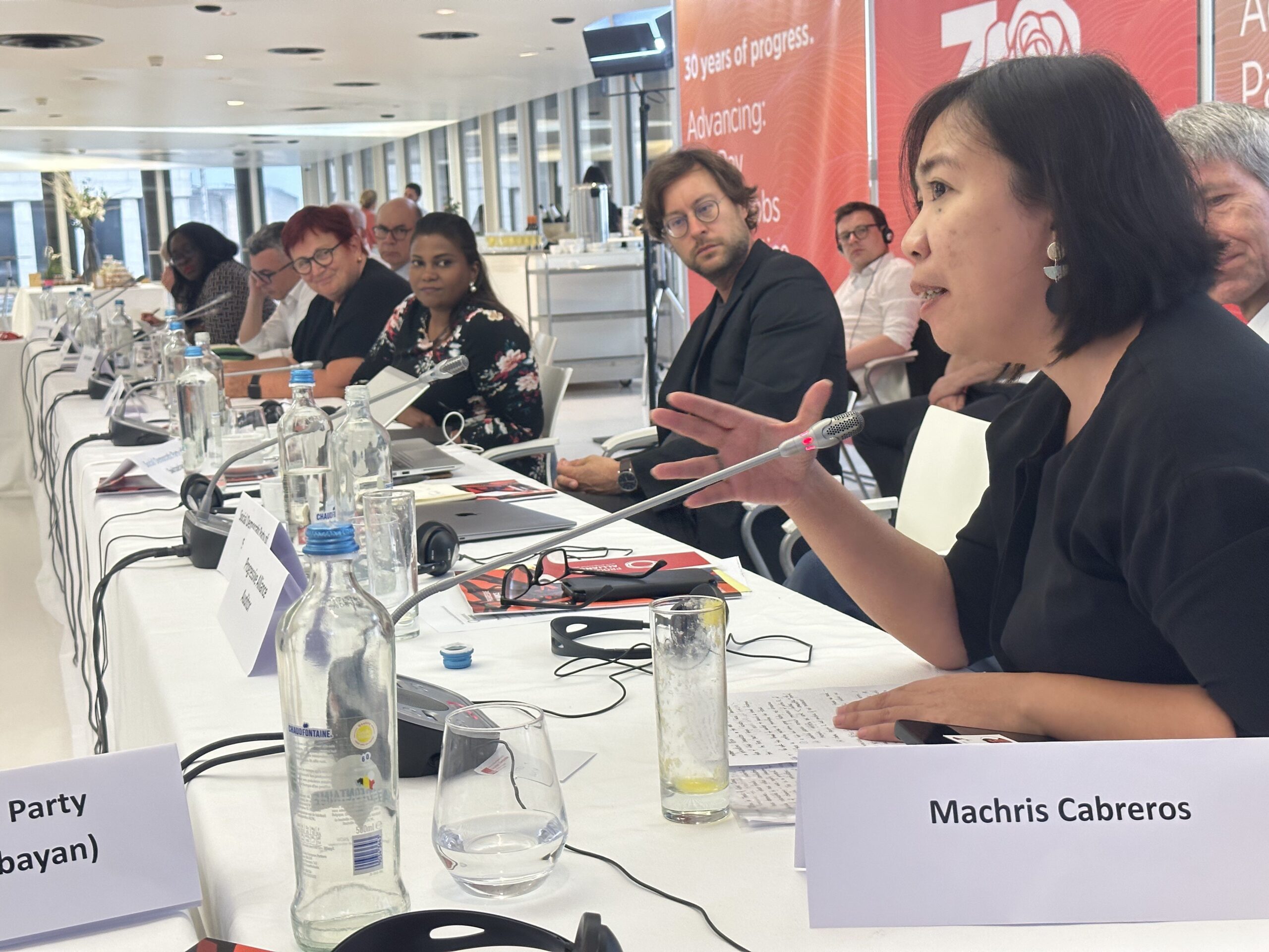 Machris Cabreros (Akbayan/Filipinas) presentó su documento de trabajo sobre «Política progresista en tiempos de cambio global», centrada en los principales retos de la desigualdad, el cambio climático, la brecha digital, la erosión democrática y el retorno de la guerra como instrumento de política exterior. Su ponencia fue muy bien acogida por los participantes en el debate.